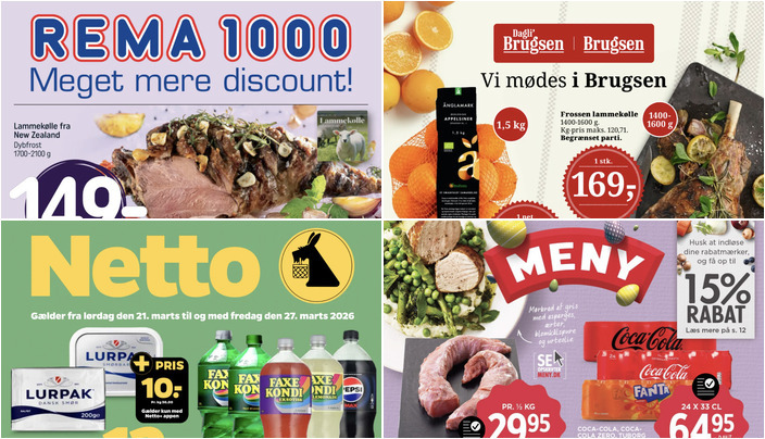 Rema 1000 tilbyder lammekølle fra New Zealand, dybfrost og vejer mellem 1700-2100 g, til en pris af 149 kr. Kg-prisen er maks. 87,64 kr. Tilbuddet gælder fra søndag den 22. marts til lørdag den 28. marts.